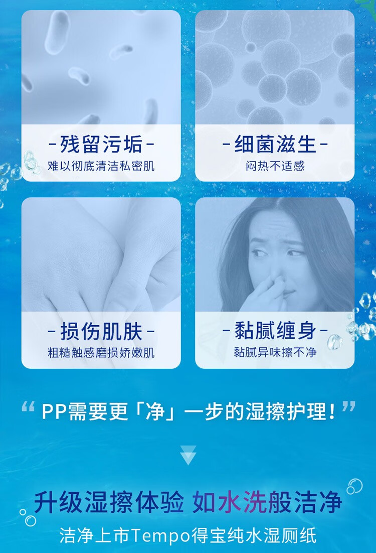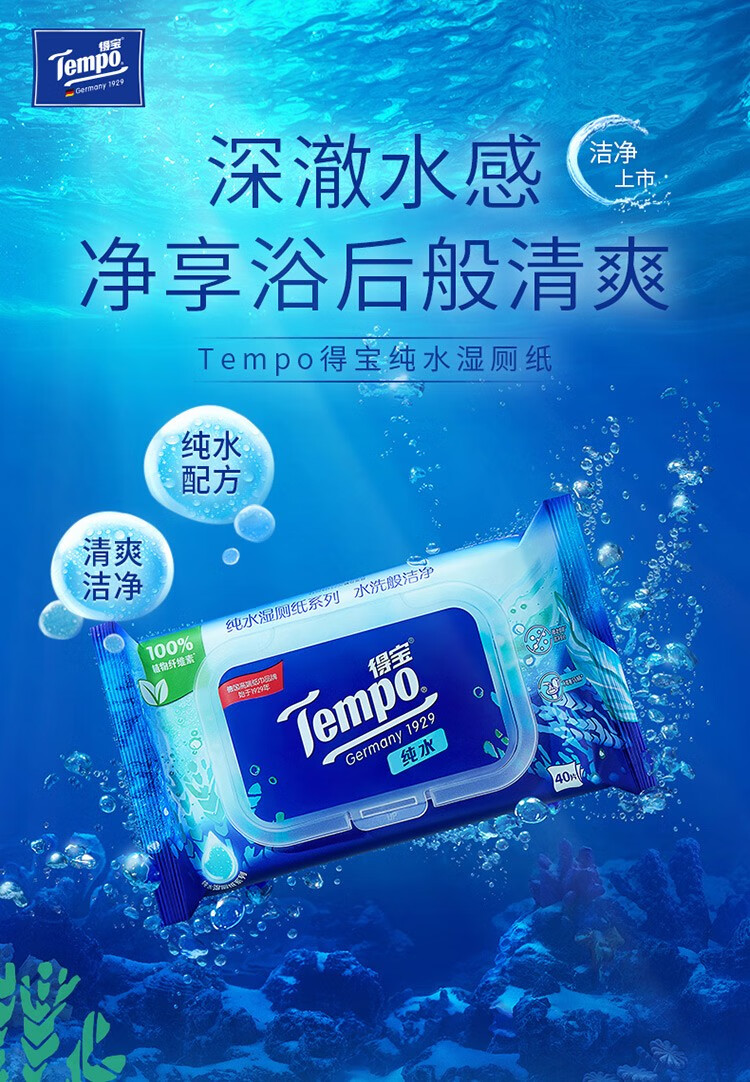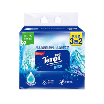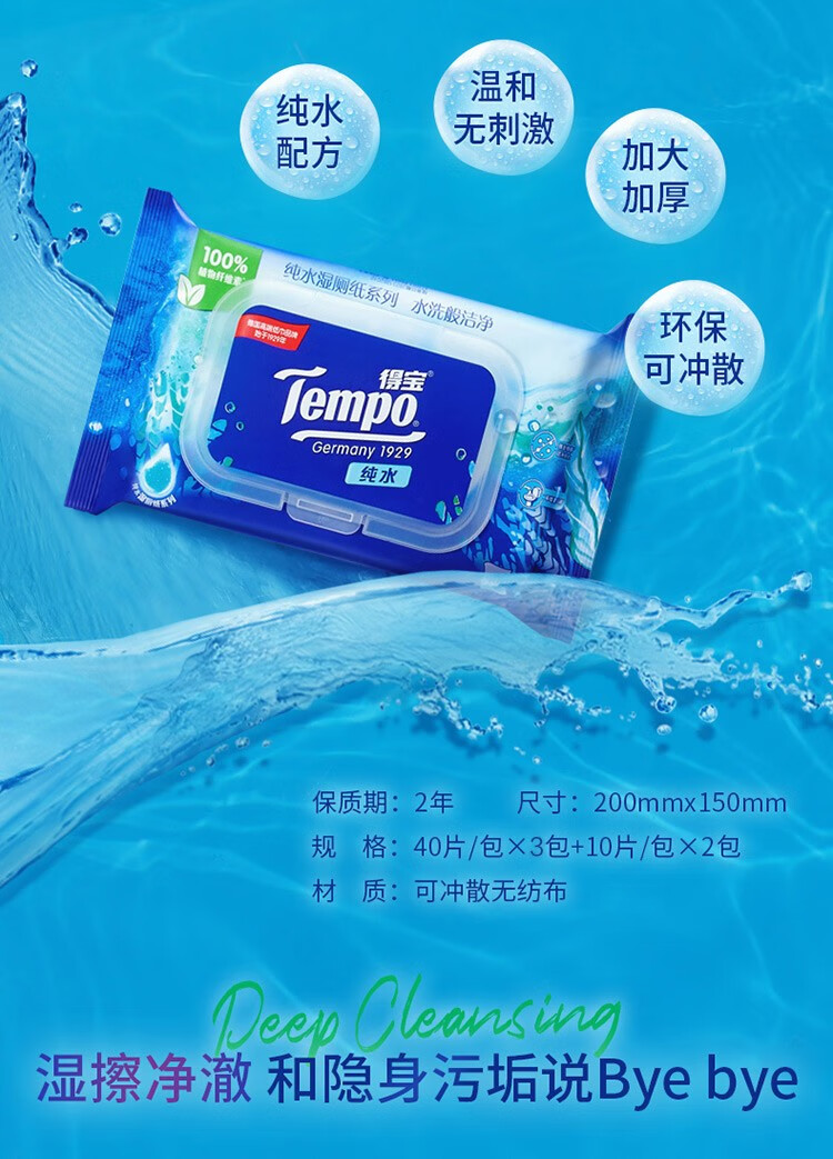 得宝(TEMPO)纯水可降解洁厕湿巾私处清洁湿厕纸40片3包+10片2包单提组合装
