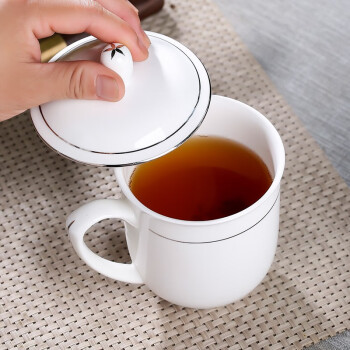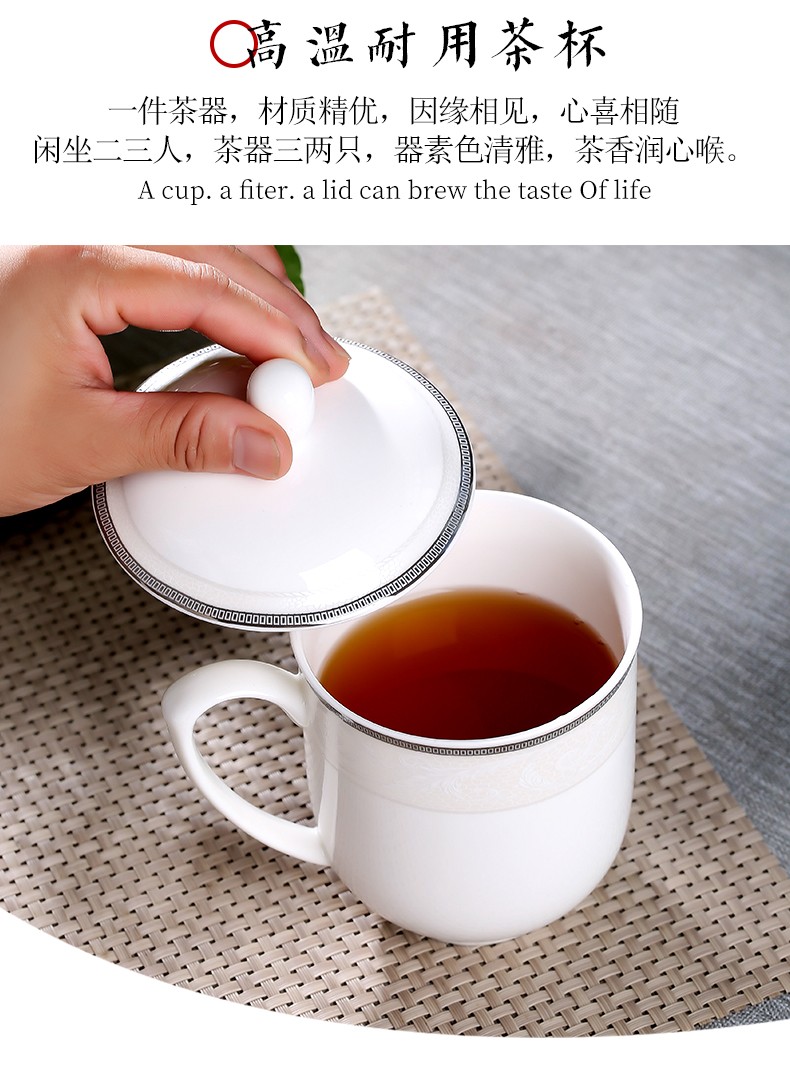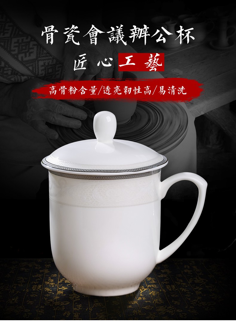 茶杯 陶瓷盖杯中号骨瓷水杯金边会议杯办公杯酒店商务喝茶开会杯子360ml
